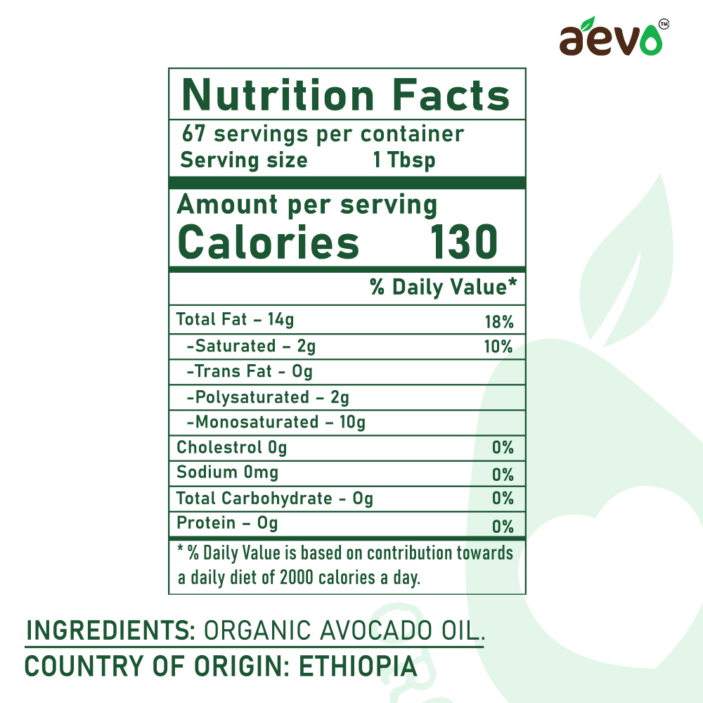 AEVO Organic and cold press oil is high in monounsaturated fats, rich in Vitamin E, antioxidants, potassium and other minerals & vitamins. The Cold Pressed Avocado oil is a nutritious option for salad dressings and dips.
